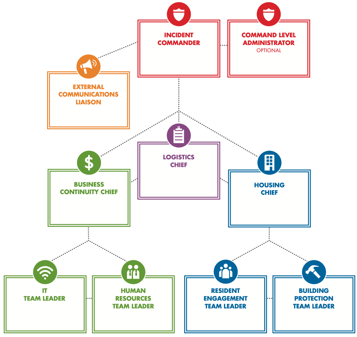 This Staffing Chart shows the recommended Disaster Response Roles to be filled by staff in your organization. The Staffing Chart is based on a chain of command led by the Incident Commander.