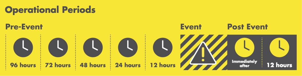 In the Disaster Staffing Toolkit, a disaster event is played out over eight operational periods, during which meetings are held and important tasks are completed by each Disaster Response Role.